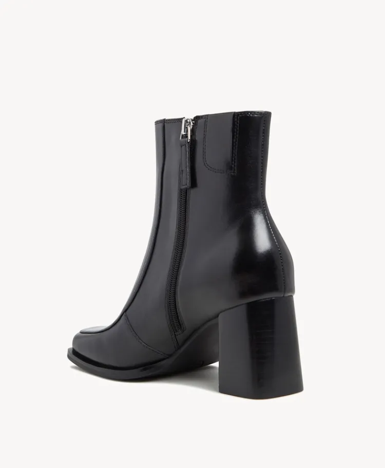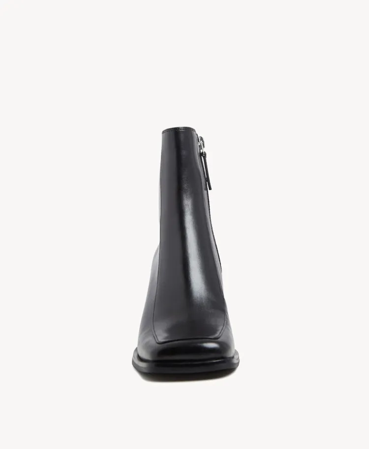 With a modern square toe and dramatic apron, this clean sided ankle boot is easily dressed up or down for both workwear and eventwear.