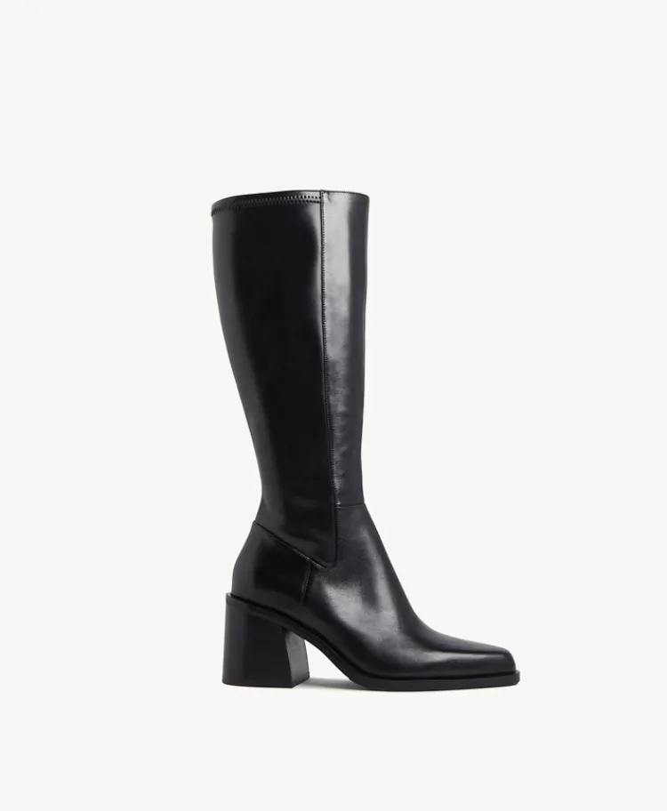 The Ava knee-high boot offers generous stretch for a diverse fit. With her bold, flared block heel and pointed toe, she can offer a striking touch to your evening looks. Pair her with a form-fitting mini dress or flared pants.