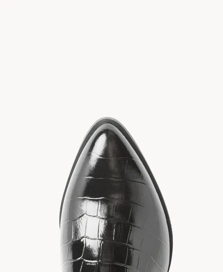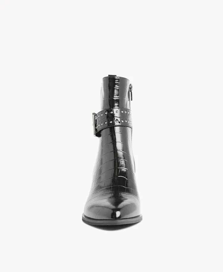 Our Blake ankle boot is sleek and sophisticated set in croc-effect leather, the whole look is tied together with a studded buckle strap. Set on a mid-height block heel, Blake is perfect for moody day to night winter wear.