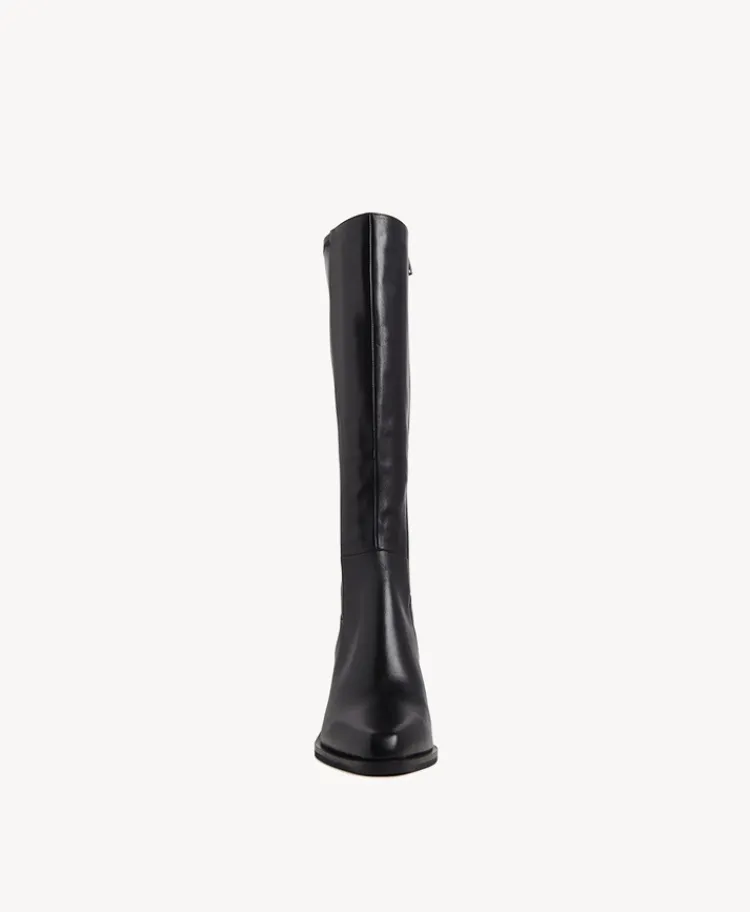 The Ava knee-high boot offers generous stretch for a diverse fit. With her bold, flared block heel and pointed toe, she can offer a striking touch to your evening looks. Pair her with a form-fitting mini dress or flared pants.