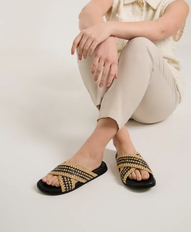 Our Carlisle sandal features cross- over rafia straps and an endlessly comfortable footbed. This slip on style makes her the ideal choice for packing in your suitcase and for seaside strolls.