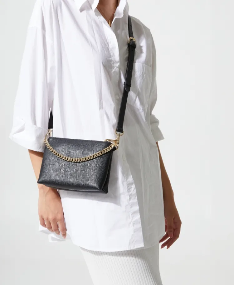 Our Dayna leather crossbody bag features a luxe chain detail that really elevates this style. The adjustable strap and zip closure takes this bag from day to night wear.