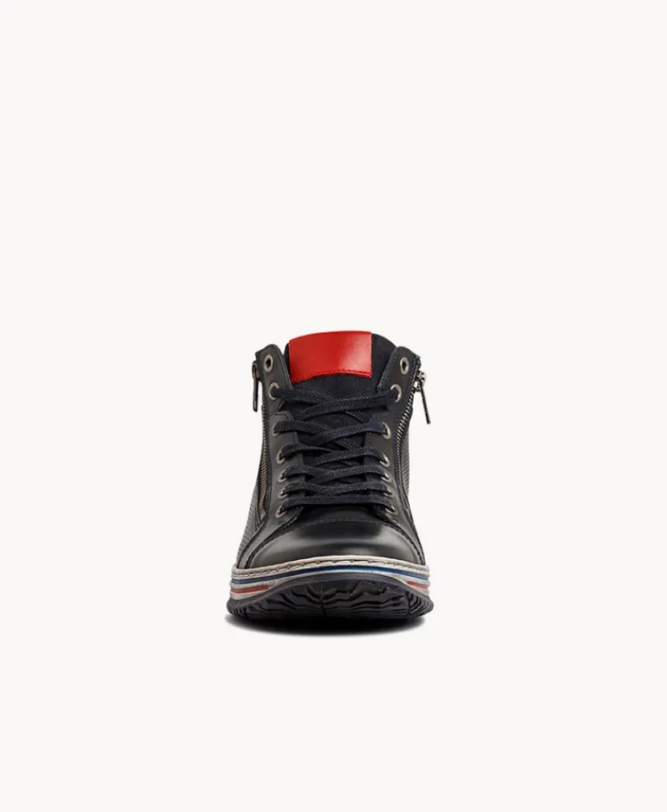 Meet our Detroit High Top Sneaker: A striped sole and eyecatching tongue make these leather sneakers by Arturo unique yet wearable. Crafted in Portugal from high quality leather, they also feature a side zip for easy foot entry. A fan favourite with Merchant 1948 men!