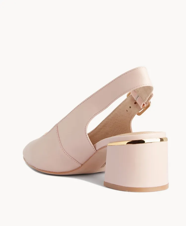 Our Dolce slingback heel is super versatile, with crisp clean style lines and an elegant metal plate heel insert. The low block heel makes these the perfect day to night style.