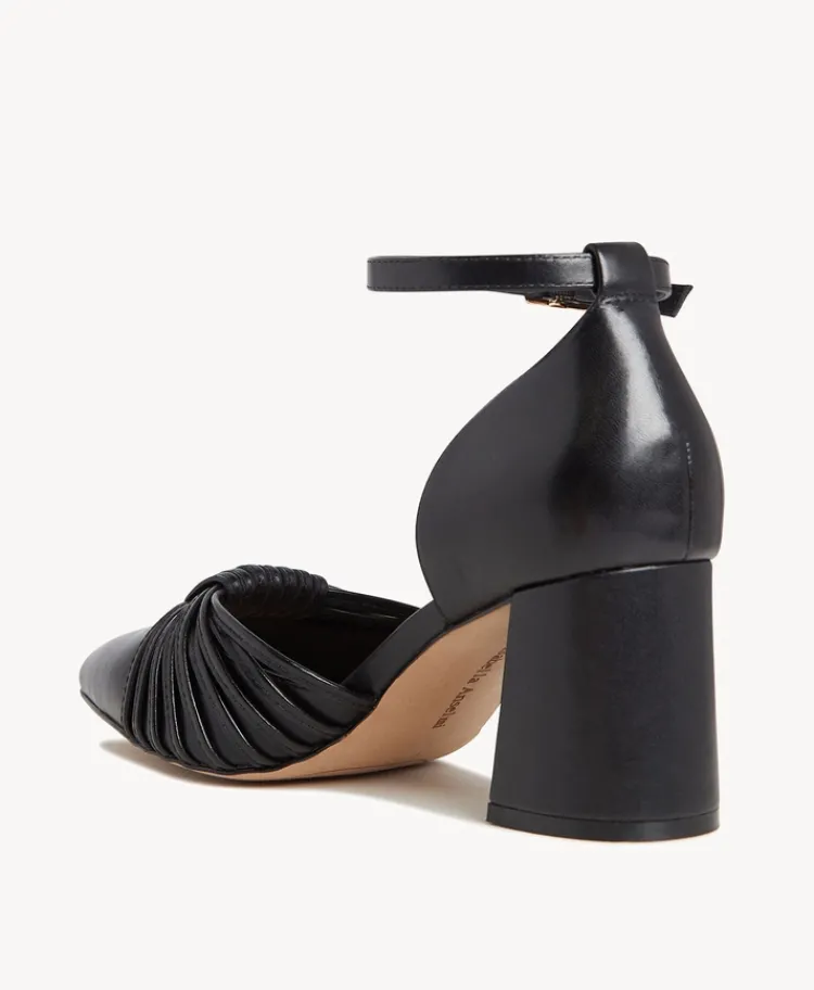 The elegant Georgie high heel features stunning bow detailing on the toe. She has a chic block heel for comfort, and a dainty ankle strap with a gold-tone buckle for a touch of luxury. She combines femininity and sophistication in one refined design.