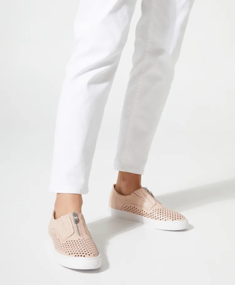 Meet Ireland. The zip hardware and perforated leather come together to elevate this summer sneaker. Wear her to the beach paired with denim for an effortless look.