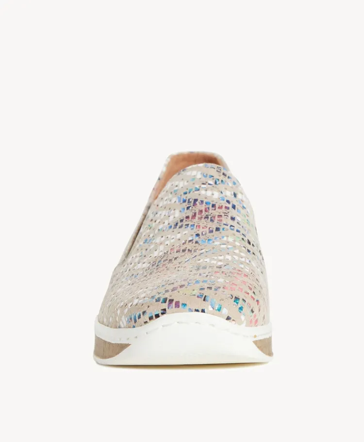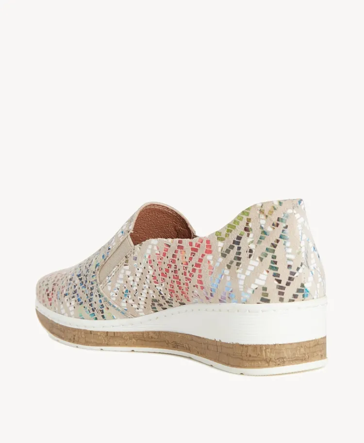 Pair our Meryl slip-on with crisp linen and bold summer prints. This perforated leather style has a rubber-soled wedge heel with cork insert, and elastic inserts for all day comfort.