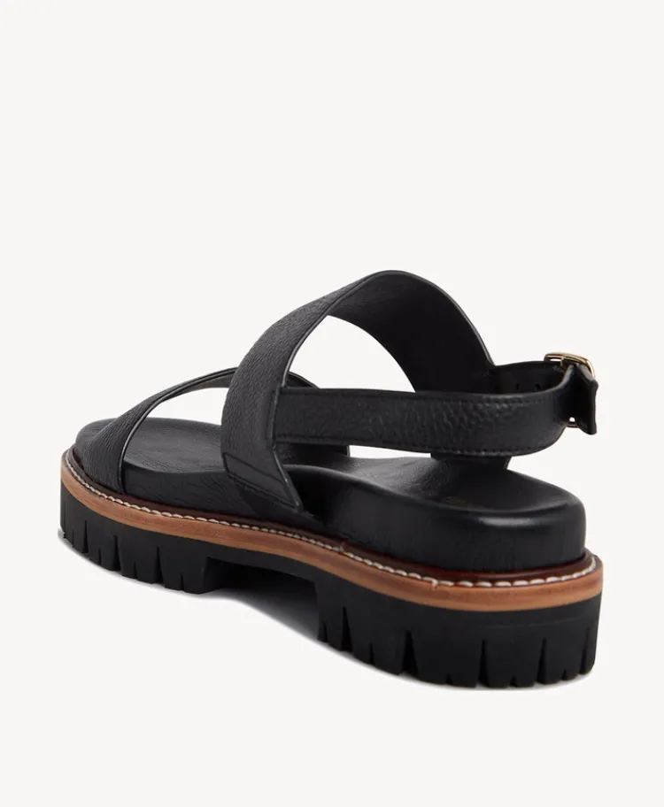 An elevated look on a classic style, our Pauline sandal features an edgy rubber sole, natural leather rand and can be paired with a gold hardware buckle. Perfect for a summer day out.