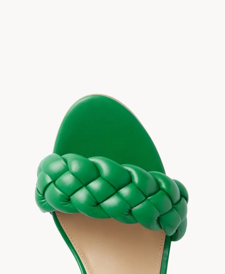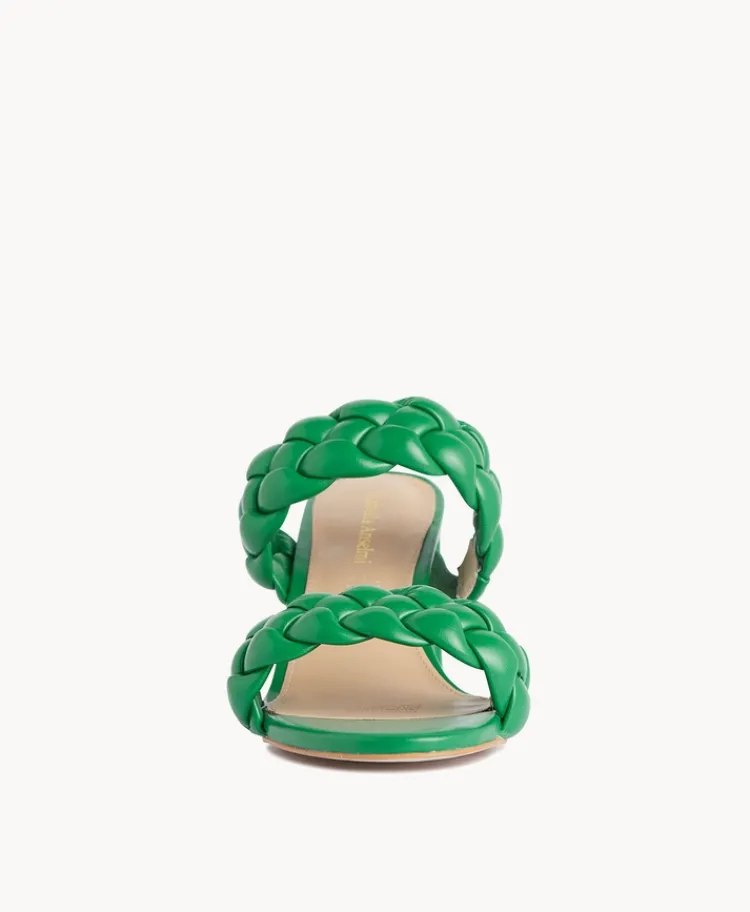 The Scooby heel, with braided non-leather straps and leather lining, makes this mule a summer must-have. Wear anywhere from bars to brunches for a punchy summer look.