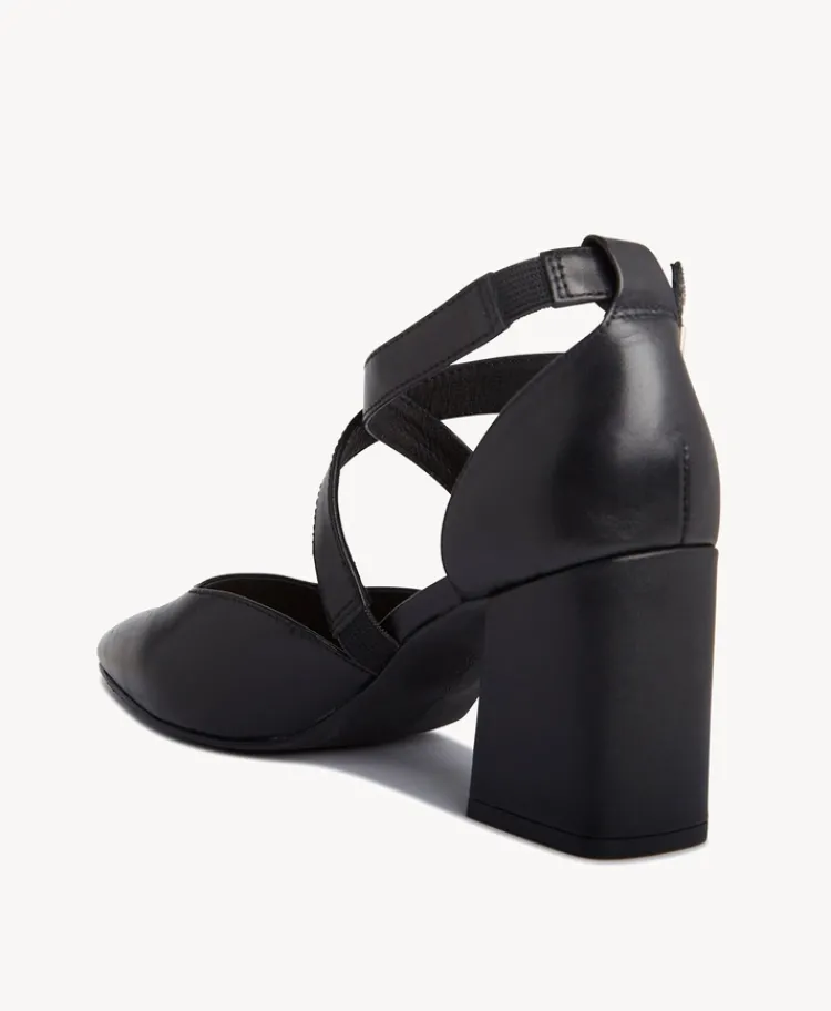 The unique cross over straps on Staten draw your eyes down, creating an elegant silhouette. Featuring a leather wrapped block heel and soft pointed toe.