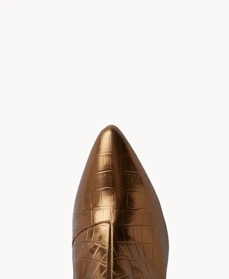 Croc embossed leather defines the Stax ankle boot, taking them from simple to sophisticated. The heel height makes them ideal for evening wear, paired with blazers for a look that speaks to confidence.